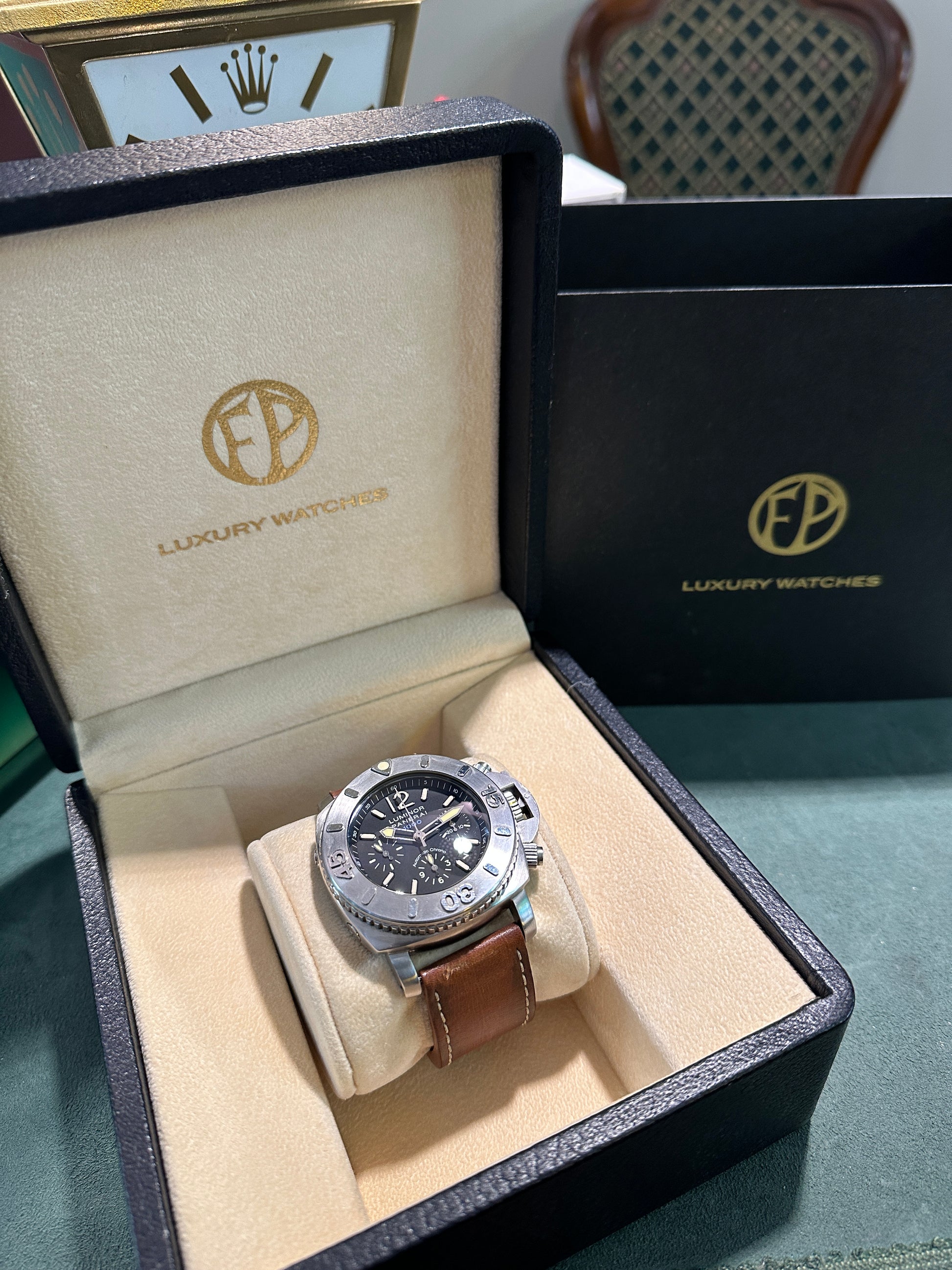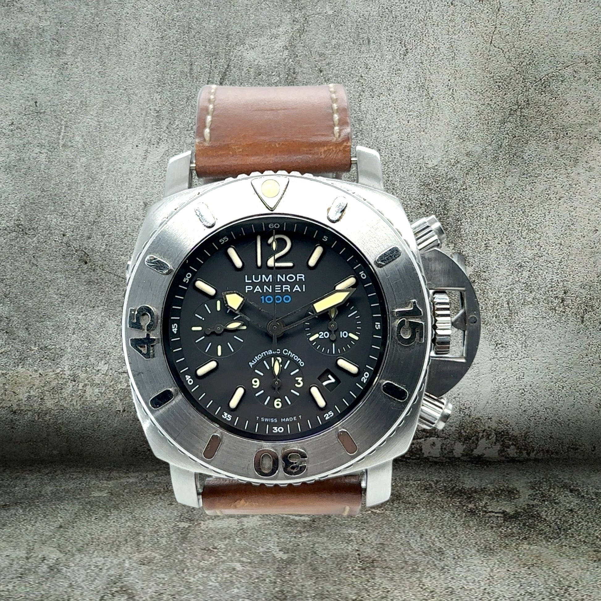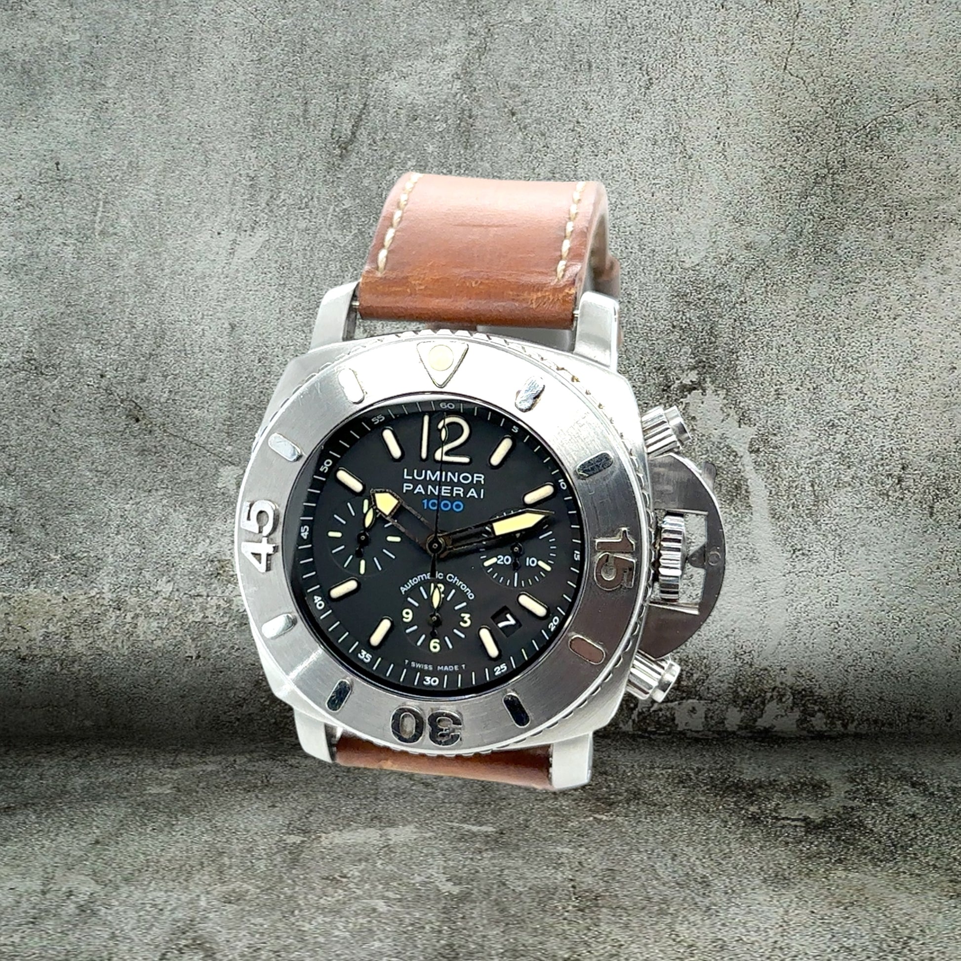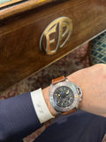 Uno dei panerai più imponenti e professionali. Resiste fino ad una profondità di 1000 metri. Funzione Chronograph, serie limitata. Mai lucidato.