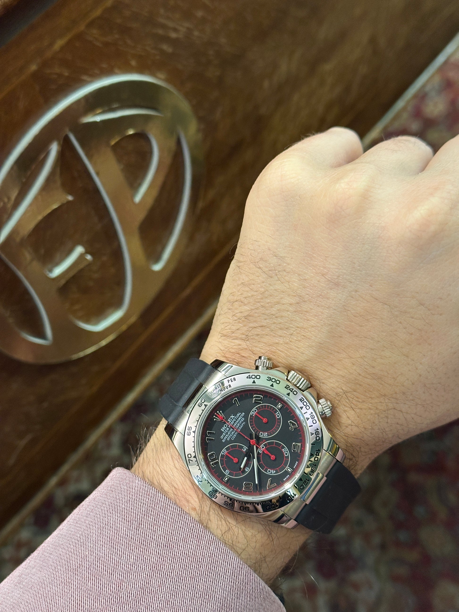 Vi proponiamo questo elegante e sportivo DAYTONA interamente in oro bianco. Quadrante Racing. Appena revisionato.